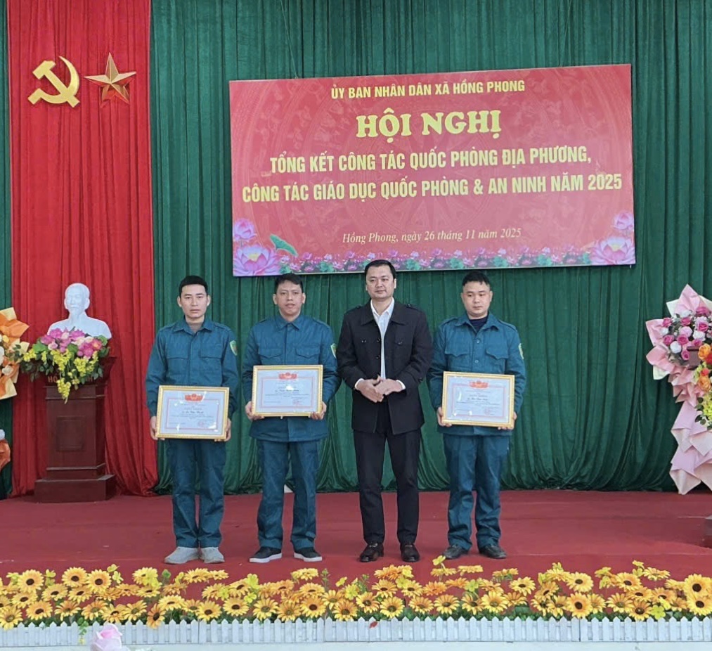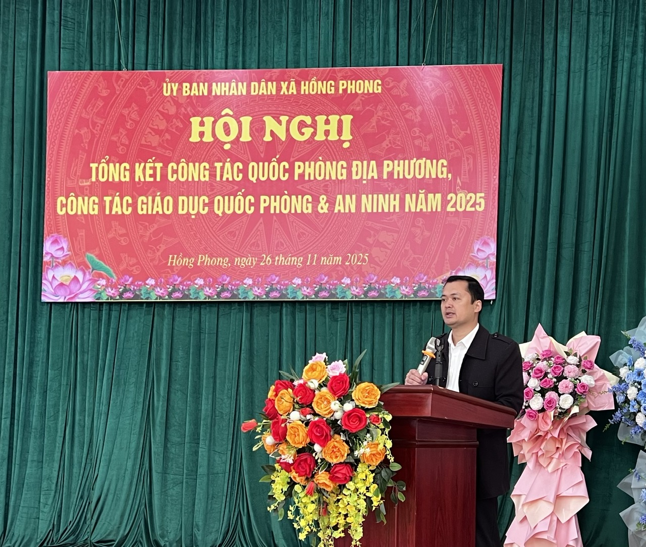Ngày 26/11/2025, UBND xã Hồng Phong tổ chức Hội nghị tổng kết công tác quốc phòng địa phương, công tác giáo dục quốc phòng và an ninh; công tác quân sự, quốc phòng năm 2025 và triển khai nhiệm vụ năm 2026. Hội nghị được tổ chức theo Kế hoạch số 52/KH-UBND ngày 21/11/2025 của UBND xã Hồng Phong về việc tổng kết công tác quốc phòng, quân sự địa phương năm 2025 và xây dựng phương hướng nhiệm vụ năm 2026.