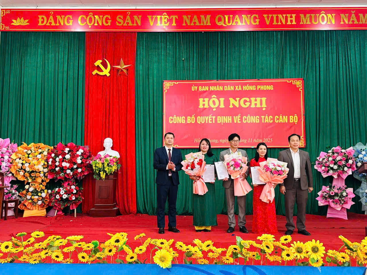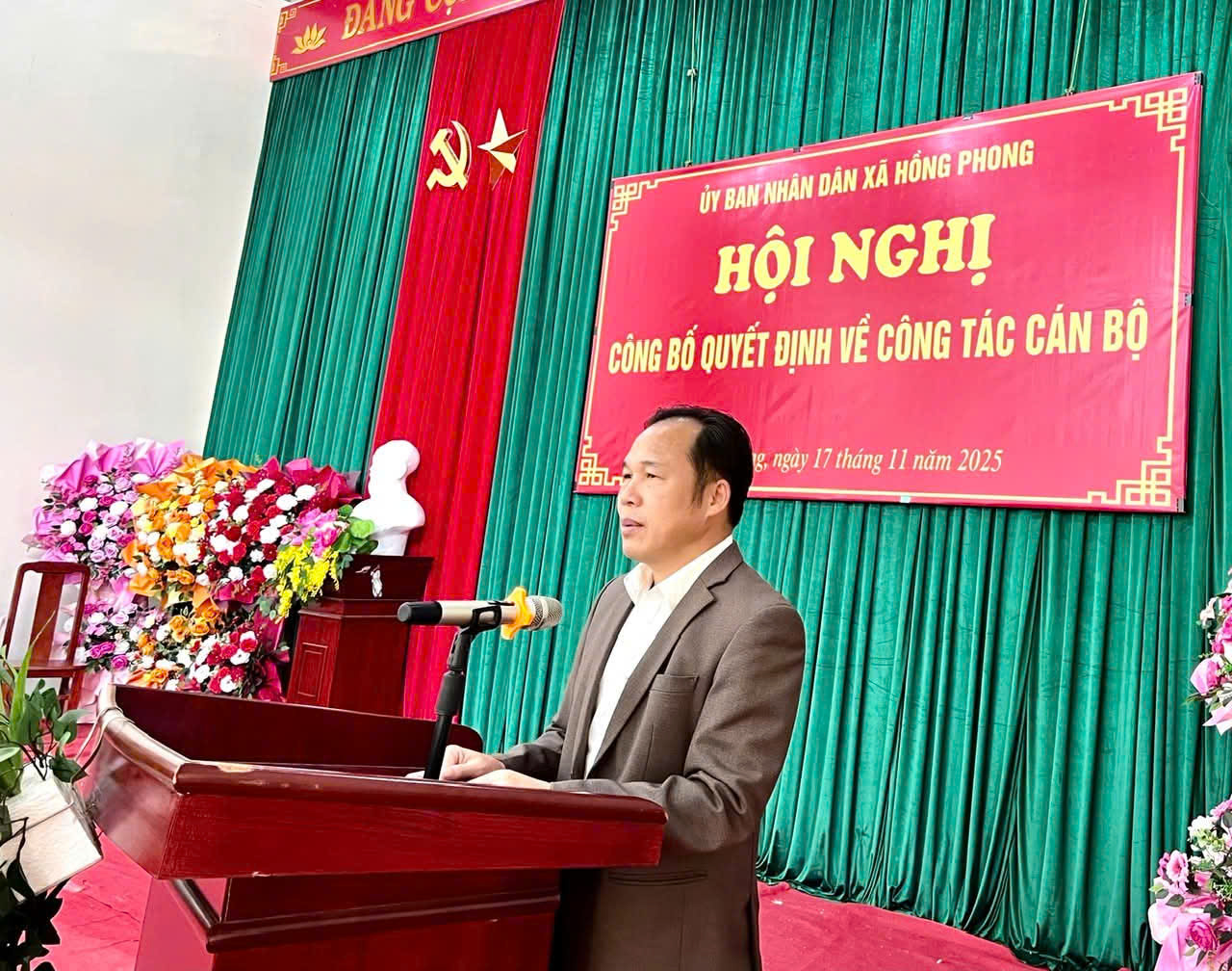 Ngày 17 tháng 11 năm 2025, UBND xã Hồng Phong tổ chức Hội nghị công bố các Quyết định về công tác cán bộ đối với một số chức danh thuộc Văn phòng HĐND & UBND xã, Phòng Văn hóa – Xã hội và Trường PTDTBT THCS Hồng Phong.