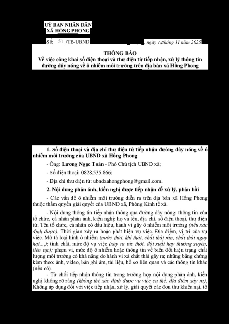 | Tiêu đề văn bản | Thông báo Công khai số điện thoại và thư điện tử tiếp nhận, xử lý thông tin đường dây nóng về ô nhiễm môi trường trên địa bàn xã Hồng Phong | ||
