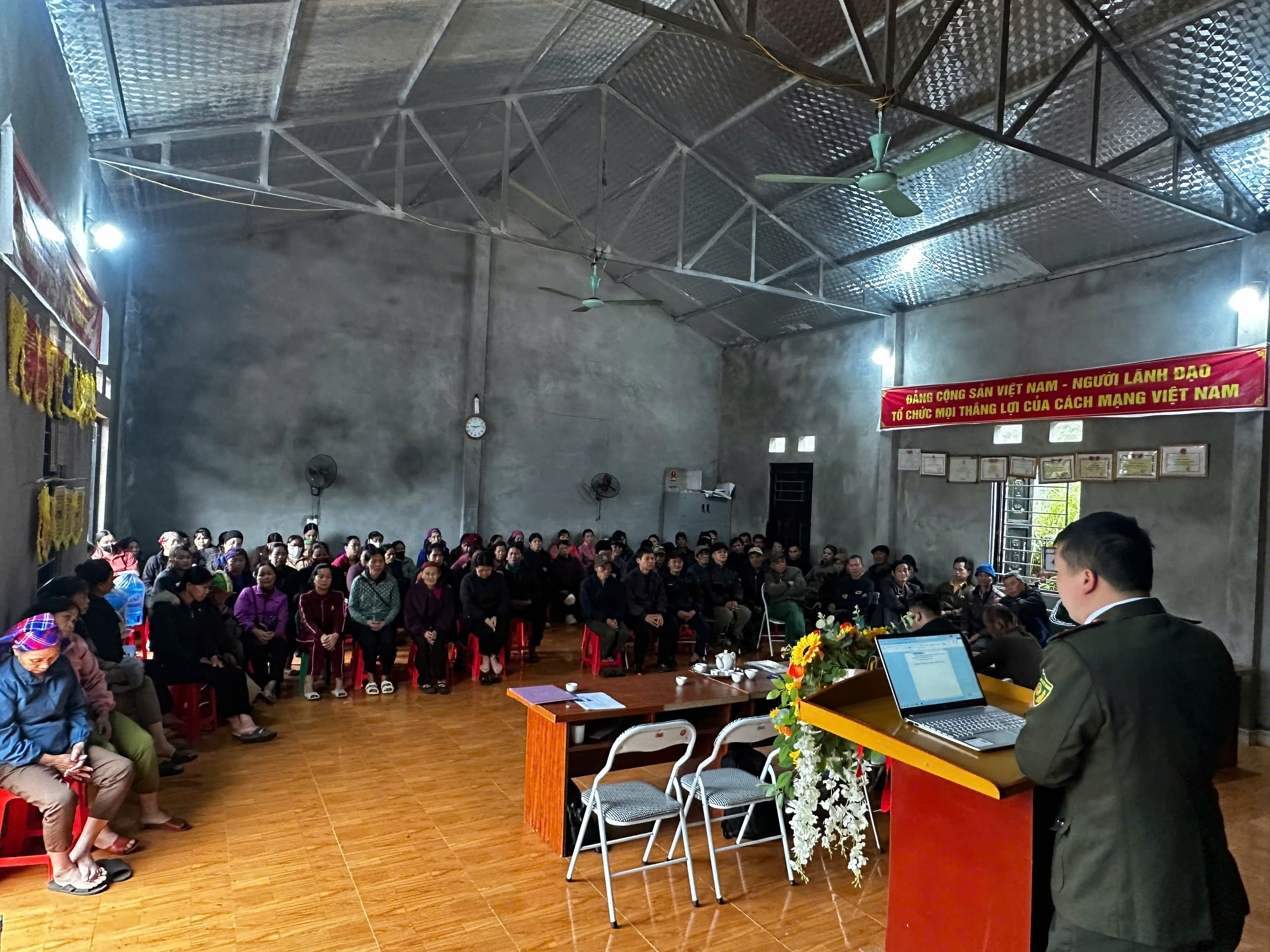 Người dân tập trung lắng nghe hướng dẫn các biện pháp phòng ngừa và xử lý khi có cháy rừng xảy ra