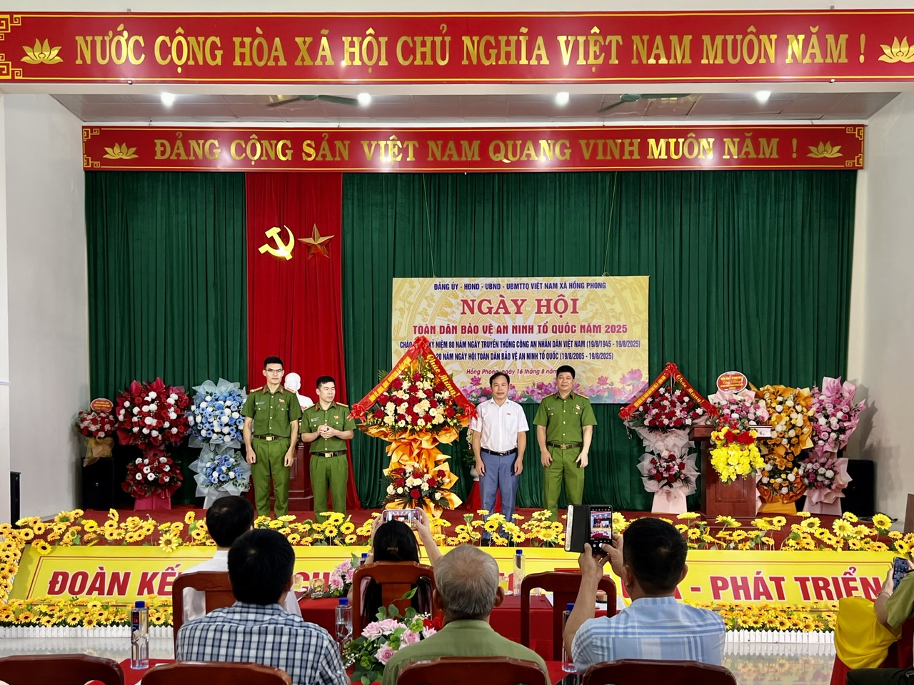 Chiều ngày 16/8/2025, tại Hội trường Nhà văn hoá xã, UBND xã Hồng Phong đã long trọng tổ chức chương trình Ngày hội Toàn dân bảo vệ an ninh Tổ quốc năm 2025 hướng tới kỷ niệm 80 năm Ngày truyền thống Công an nhân dân (19/8/1945 – 19/8/2025) và 20 năm Ngày hội toàn dân bảo vệ an ninh Tổ quốc (19/8/2005 – 19/8/2025), với sự tham dự của hơn 200 đại biểu là đại diện lãnh đạo các cơ quan, đơn vị, trường học, Trạm Y tế, doanh nghiệp, đại biểu là đại diện các tổ bảo vệ an ninh trật tự cơ sở và toàn thể lãnh đạo, chiến sĩ công an trên địa bàn xã.