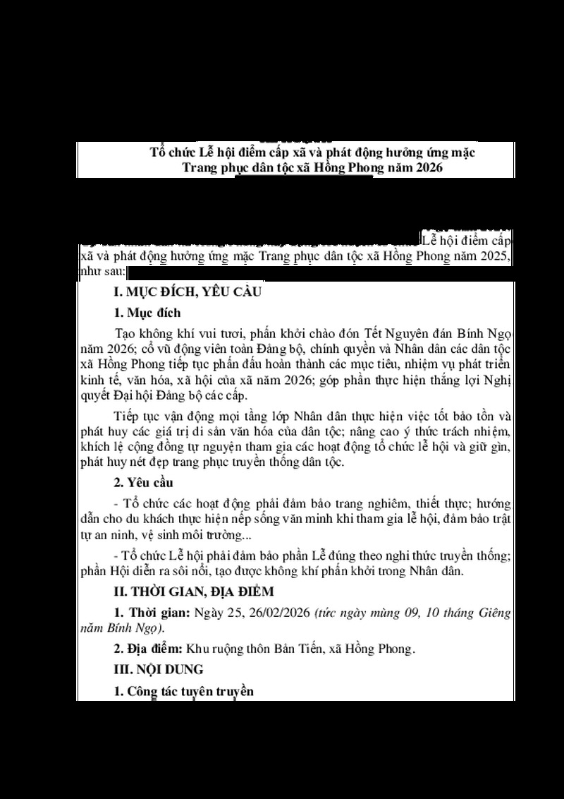 | Tiêu đề văn bản | KẾ HOẠCH Tổ chức Lễ hội điểm cấp xã và phát động hưởng ứng mặc Trang phục dân tộc xã Hồng Phong năm 2026 | ||
