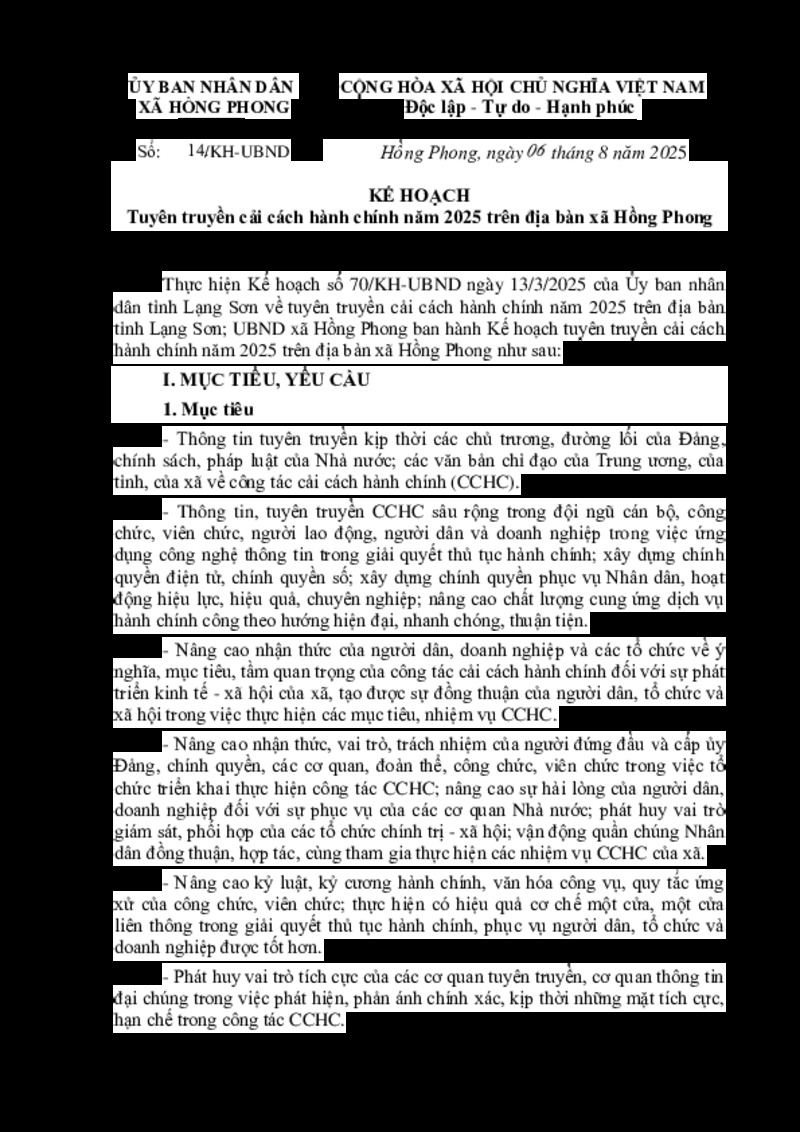 Tiêu đề văn bản | Kế hoạch Tuyên truyền Cải cách hành chính năm 2025 trên địa bàn xã Hồng Phong | ||